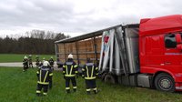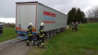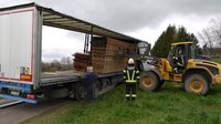 Auf Grund der Beschaffenheit des Bodens missglückte dieses Manöver allerdings. Mithilfe der Feuerwehr konnte ein Radlader organisiert werden, welcher den mit Holzplatten geladenen Auflieger entlädt. Zur Sicherung wurde der LKW mit der Einbauseilwinde des TLF gehalten. Mit einigen Tonnen weniger konnte der Fahrer das Gespann nun zurücksetzen. Im Anschluss wurde die Ladung wieder auf den Sattelzug gehoben und gesichert. Nach gut zwei Stunden war der Einsatz für die Feuerwehrkräfte vorbei.